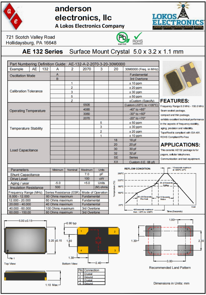 安德森進口無源晶振,AE132汽車大燈晶振,AE-132-A-2-2070-3-20-30M0000高品質(zhì)晶振,美國安德森晶振公司,Anderson晶振,AE-132晶振,無源晶振,貼片晶振,7050晶振,高精度晶振,高品質(zhì)晶振,美國晶振,進口晶振,低損耗晶振,高質(zhì)量晶振,通訊設(shè)備晶振,路由器晶振,石英晶振,產(chǎn)品具有高精度超小型的表面貼片型石英晶體振蕩器,最適用于移動通信終端的基準時鐘等移動通信領(lǐng)域.比如智能手機,無線通信,衛(wèi)星導航,平臺基站等較高端的數(shù)碼產(chǎn)品,晶振本身小型,薄型具備各類移動通信的基準時鐘源用頻率,貼片晶振具有優(yōu)良的電氣特性,耐環(huán)境性能適用于移動通信領(lǐng)域,滿足無鉛焊接的高溫回流溫度曲線要求,符合RoHS/無鉛。