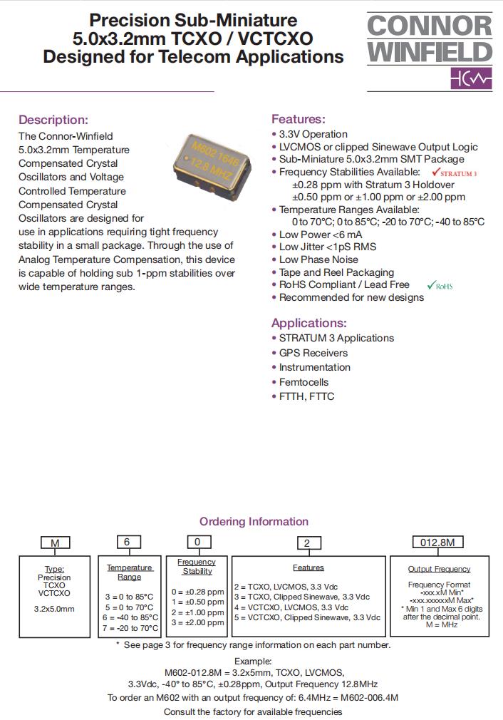 M724-020.0M,進口VC-TCXO晶振,6G模塊晶振,美國ConnorWinfield晶振,M72有源晶振,M724-020.0M晶振,5032mm晶振,VC-TCXO晶振,進口SMD晶振,LVCMOS輸出晶振,頻率20MHz,電壓3.3V,工作溫度-20~70°C,頻率穩(wěn)定性1ppm,低相位噪聲晶振,高可靠性晶振,6G模塊晶振,第三層應(yīng)用晶振,GPS導(dǎo)航晶振,儀器儀表應(yīng)用晶振,無線網(wǎng)絡(luò)晶振.