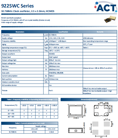ACT晶振,9225WC晶振,有源晶體振蕩器.貼片晶振本身體積小,超薄型石英晶體振蕩器,特別適用于有目前高速發(fā)展的高端電子數(shù)碼產(chǎn)品,因?yàn)榫д癖旧硇⌒突枨蟮氖袌?chǎng)領(lǐng)域,小型,薄型是對(duì)應(yīng)陶瓷振蕩器(偏差大)和普通的石英晶體振蕩器(偏差小)的中間領(lǐng)域的一種性?xún)r(jià)比較出色的產(chǎn)品.產(chǎn)品廣泛用于筆記本電腦,無(wú)線電話,衛(wèi)星導(dǎo)航HDD, SSD, USB, Blu-ray等用途,符合無(wú)鉛焊接的高溫回流焊曲線特性.