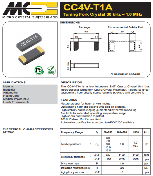 Microcrystal晶振,CC4V-T1A-32.768kHz-12.5pF-20PPM-TA-QC晶振,CC4V-T1A晶振,無鉛環保晶體.貼片石英晶體,體積小,焊接可采用自動貼片系統,產品本身小型,表面貼片晶振,特別適用于有小型化要求的電子數碼產品市場領域,因產品小型,薄型優勢,耐環境特性,包括耐高溫,耐沖擊性等,在移動通信領域得到了廣泛的應用,晶振產品本身可發揮優良的電氣特性,滿足無鉛焊接的高溫回流溫度曲線要求.
