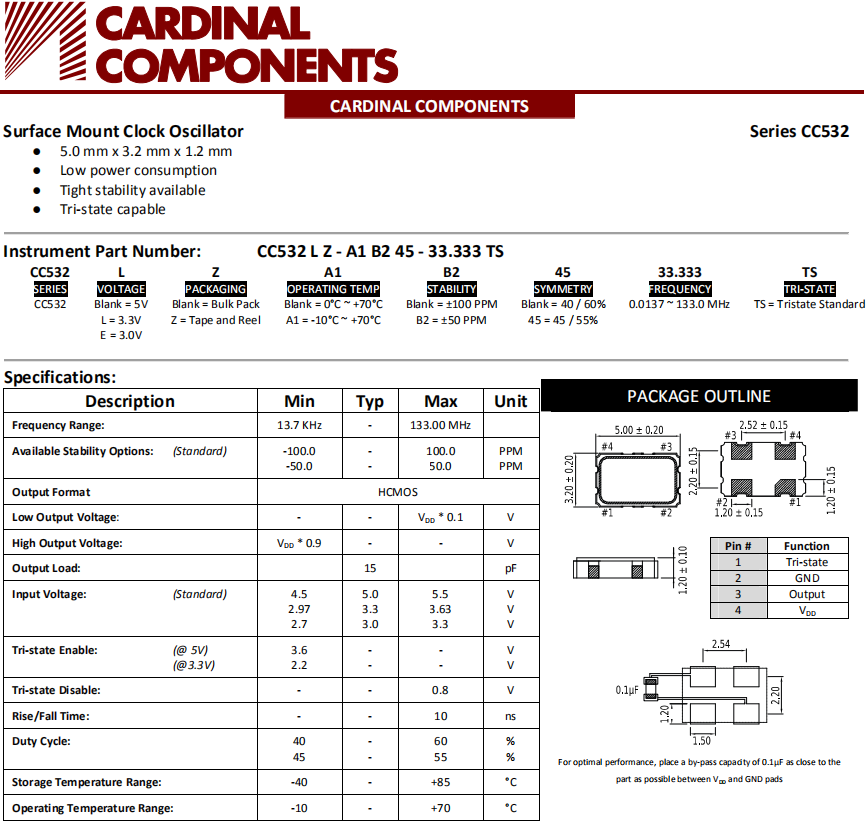 Cardinal晶振,CC532晶振,石英晶體振蕩器.5032mm體積的石英晶體振蕩器有源晶振,改產品可驅動2.5V的溫補晶振,壓控晶振,VC-TCXO晶體振蕩器產品,電源電壓的低電耗型,編帶包裝方式,可對應自動高速貼片機自動焊接,及IR回流焊接(無鉛對應),為無鉛產品,超小型,質地輕.產品被廣泛應用到集成電路,程控交換系統(tǒng),無線發(fā)射基站.