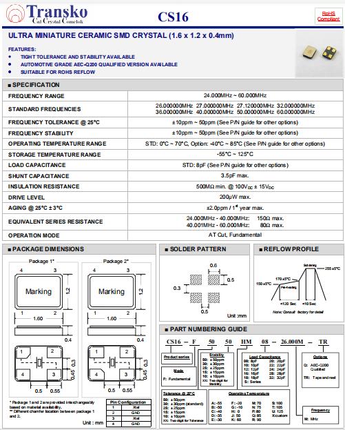 | Transko晶振 | 單位 | CS16晶振 | 石英晶振基本條件 |