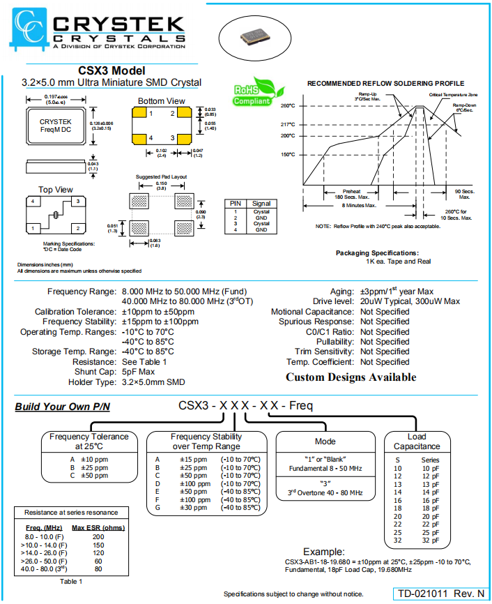 CRYSTEK晶振,CSX3晶振,高性能石英晶體.小型表面貼片晶振型,是標準的石英晶體諧振器,適用于寬溫范圍的電子數碼產品,家電電器及MP3,MP4,播放器,單片機等領域.可對應8.000MHz以上的頻率,在電子數碼產品,以及家電相關電器領域里面發揮優良的電氣特性,滿足無鉛焊接的回流溫度曲線要求.