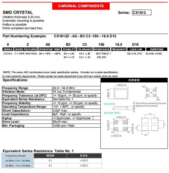 Cardinal晶振,CX1612晶振,進口貼片晶振.貼片晶振本身體積小,超薄型石英晶體諧振器,特別適用于有目前高速發展的高端電子數碼產品,因為晶振本身小型化需求的市場領域,小型,薄型是對應陶瓷諧振器(偏差大)和普通的壓電石英晶體諧振器(偏差小)的中間領域的一種性價比較出色的產品.產品廣泛用于筆記本電腦,無線電話,衛星導航HDD, SSD, USB, Blu-ray等用途,符合無鉛焊接的高溫回流焊曲線特性.