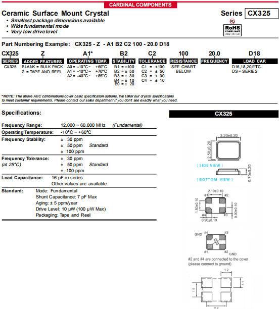 Cardinal晶振,CX325晶振,壓電石英晶體.小型貼片石英晶振,外觀尺寸具有薄型表面貼片型石英晶體諧振器,特別適用于有小型化要求的市場(chǎng)領(lǐng)域,比如智能手機(jī),無線藍(lán)牙,平板電腦等電子數(shù)碼產(chǎn)品.晶振本身超小型,薄型,重量輕,晶體具有優(yōu)良的耐環(huán)境特性,如耐熱性,耐沖擊性,在辦公自動(dòng)化,家電相關(guān)電器領(lǐng)域及Bluetooth,Wireless LAN等短距離無線通信領(lǐng)域可發(fā)揮優(yōu)良的電氣特性,滿足無鉛焊接的回流溫度曲線要求.