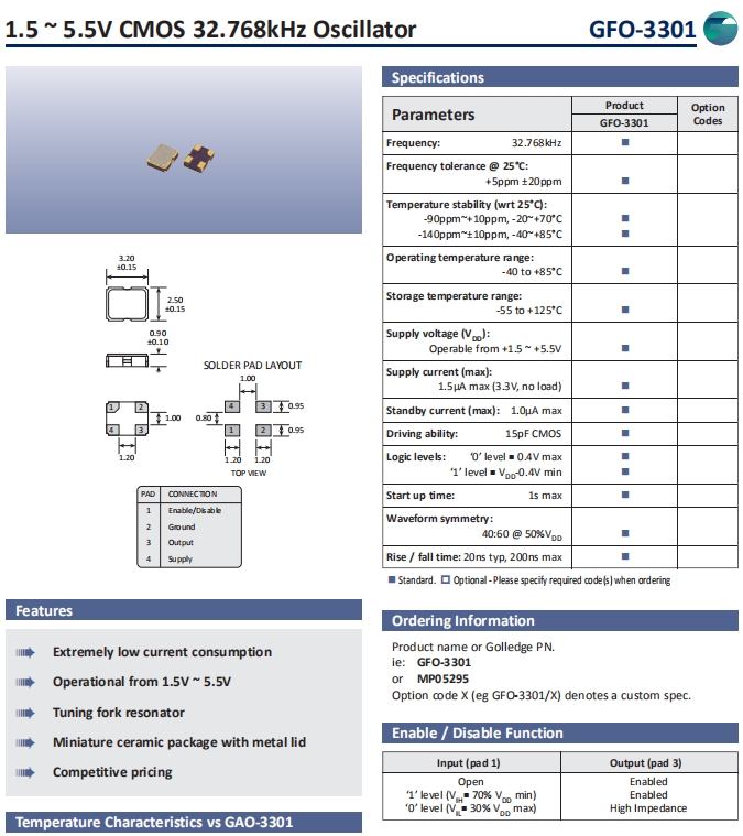 Golledge晶振,GFO-3301晶振,時鐘晶體振蕩器.小體積貼片時鐘晶體諧振器,是貼片音叉晶體,千赫頻率元件,應用于時鐘模塊,智能手機,導航定位系統,因產品本身體積小,貼片編帶型,可應用于高性能自動貼片焊盤,被廣泛應用到各種小巧的便攜式消費電子數碼時間產品,環保性能符合ROHS/無鉛認證.