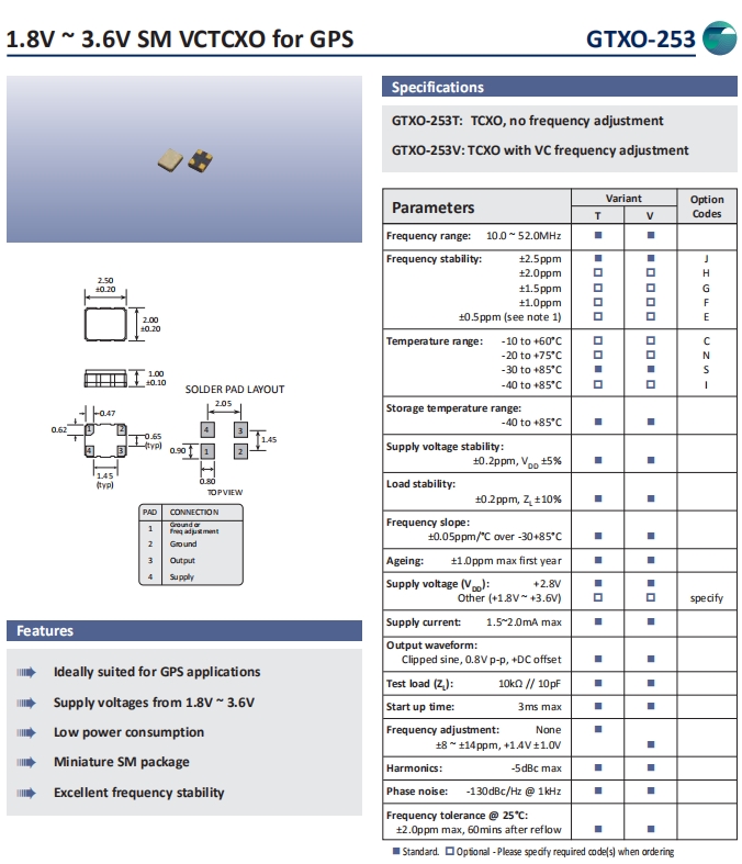 Golledge晶振,GTXO-253晶振,高質(zhì)量晶振..貼片石英晶體,體積小,焊接可采用自動貼片系統(tǒng),產(chǎn)品本身小型,表面貼片晶振,特別適用于有小型化要求的電子數(shù)碼產(chǎn)品市場領(lǐng)域,因產(chǎn)品小型,薄型優(yōu)勢,耐環(huán)境特性,包括耐高溫,耐沖擊性等,在移動通信領(lǐng)域得到了廣泛的應(yīng)用,晶振產(chǎn)品本身可發(fā)揮優(yōu)良的電氣特性,滿足無鉛焊接的高溫回流溫度曲線要求.