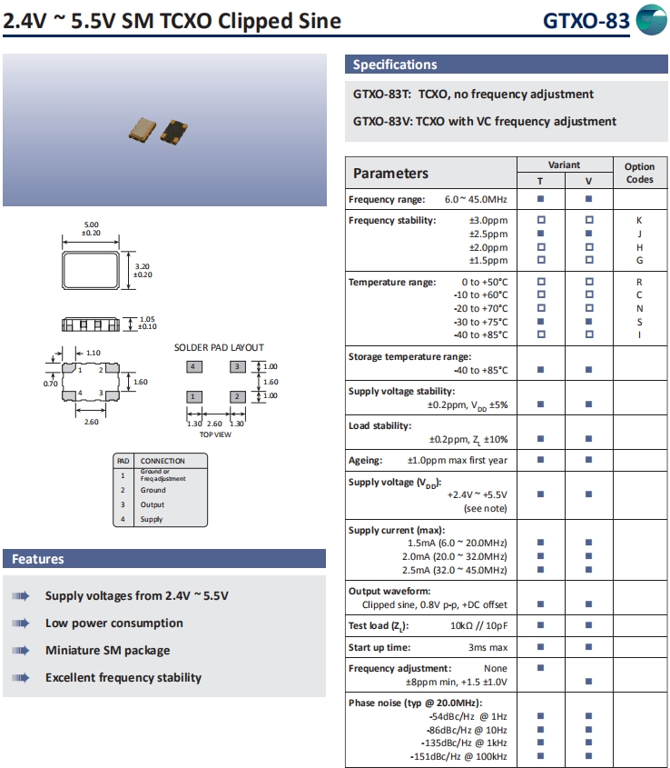 Goliedge晶振,GTXO-83晶振,溫補晶振.5032mm體積的石英晶體振蕩器有源晶振,改產品可驅動2.5V的溫補晶振,壓控晶振,VC-TCXO晶體振蕩器產品,電源電壓的低電耗型,編帶包裝方式,可對應自動高速貼片機自動焊接,及IR回流焊接(無鉛對應),為無鉛產品,超小型,質地輕.產品被廣泛應用到集成電路,程控交換系統(tǒng),無線發(fā)射基站.