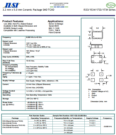 ILSI晶振,I533晶振,溫補(bǔ)晶振.貼片石英晶體,體積小,焊接可采用自動(dòng)貼片系統(tǒng),產(chǎn)品本身小型,表面貼片晶振,特別適用于有小型化要求的電子數(shù)碼產(chǎn)品市場領(lǐng)域,因產(chǎn)品小型,薄型優(yōu)勢,耐環(huán)境特性,包括耐高溫,耐沖擊性等,在移動(dòng)通信領(lǐng)域得到了廣泛的應(yīng)用,晶振產(chǎn)品本身可發(fā)揮優(yōu)良的電氣特性,滿足無鉛焊接的高溫回流溫度曲線要求.
