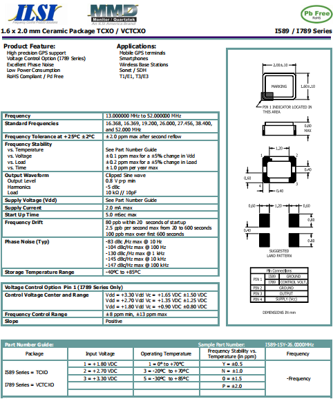 ILSI晶振,I589晶振,TCXO晶振.貼片石英晶振,體積小,焊接可采用自動貼片系統(tǒng),產(chǎn)品本身小型,表面貼片晶振,特別適用于有小型化要求的電子數(shù)碼產(chǎn)品市場領(lǐng)域,因產(chǎn)品小型,薄型優(yōu)勢,耐環(huán)境特性,包括耐高溫,耐沖擊性等,在移動通信領(lǐng)域得到了廣泛的應(yīng)用,晶振產(chǎn)品本身可發(fā)揮優(yōu)良的電氣特性,滿足無鉛焊接的高溫回流溫度曲線要求.