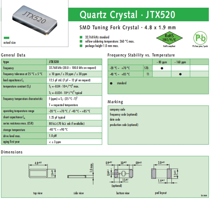 JAUCH晶振,JTX520晶振,高性能石英晶體.貼片晶振本身體積小,超薄型石英晶體諧振器,特別適用于有目前高速發展的高端電子數碼產品,因為晶振本身小型化需求的市場領域,小型,薄型是對應陶瓷諧振器(偏差大)和普通的石英晶體諧振器(偏差?。┑闹虚g領域的一種性價比較出色的產品.產品廣泛用于筆記本電腦,無線電話,衛星導航HDD, SSD, USB, Blu-ray等用途,符合無鉛焊接的高溫回流焊曲線特性.
