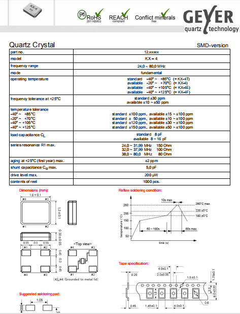 Geyer晶振,KX-4晶振,低功耗環(huán)保晶體.小型表面貼片晶振型,是標準的石英晶體諧振器,適用于寬溫范圍的電子數(shù)碼產(chǎn)品,家電電器及MP3,MP4,播放器,單片機等領域.可對應24.000MHz以上的頻率,在電子數(shù)碼產(chǎn)品,以及家電相關電器領域里面發(fā)揮優(yōu)良的電氣特性,滿足無鉛焊接的回流溫度曲線要求.