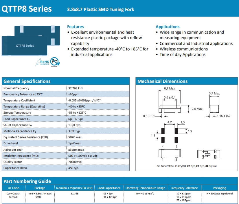 Quarztechnik晶振,QTTP8晶振,石英水晶振子.普通貼片石英晶振外觀使用金屬材料封裝的,具有高穩定性,高可靠性的石英晶體諧振器,晶振外觀本身使用金屬封裝,充分的密封性能,可確保其高可靠性,采用編帶包裝,外包裝采用朔膠盤,可在自動貼片機上對應自動貼裝等優勢.