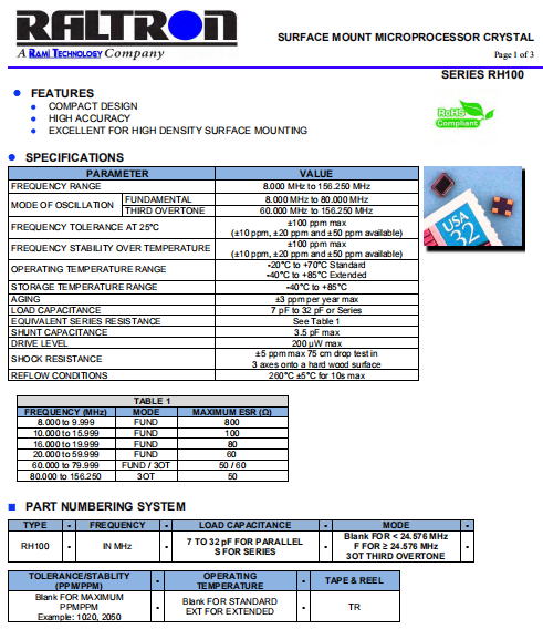 | Raltron晶振 | 單位 | RH100晶振 | 石英晶振基本條件 |
