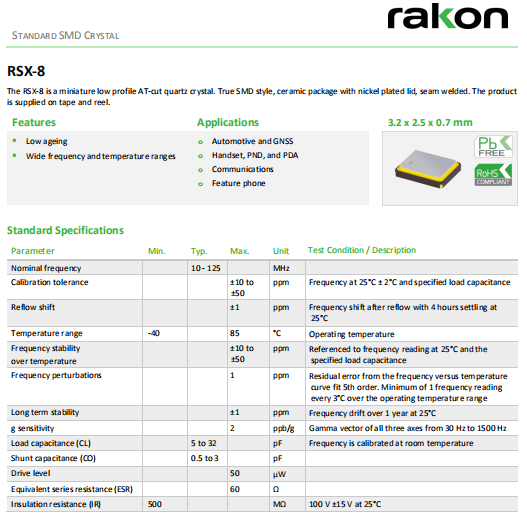| Rakon晶振 | 單位 | RSX-8晶振 | 石英晶振基本條件 |