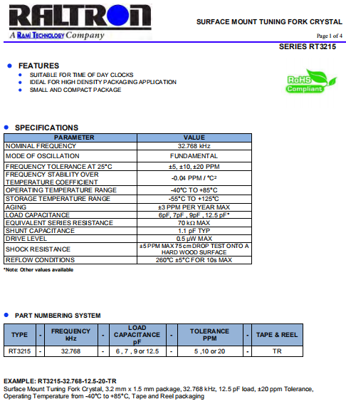 Raltron晶振,RT3215晶振,無源石英晶體.32.768K晶振.貼片晶振本身體積小,超薄型石英晶體諧振器,特別適用于有目前高速發展的高端電子數碼產品,因為石英晶振本身小型化需求的市場領域,小型,薄型是對應陶瓷諧振器(偏差大)和普通的石英晶體諧振器(偏差小)的中間領域的一種性價比較出色的產品.產品廣泛用于筆記本電腦,無線電話,衛星導航HDD,SSD,USB,Blu-ray等用途,符合無鉛焊接的高溫回流焊曲線特性.