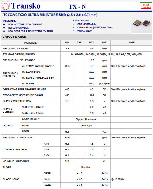 Transko晶振,TX-N晶振,低電壓振蕩器.有源晶振,是只晶體本身起振需要外部電壓供應(yīng),起振后可直接驅(qū)動(dòng)CMOS 集成電路,產(chǎn)品本身已實(shí)現(xiàn)與薄型IC(TSSOP封裝,TVSOP封裝)同樣的1mm厚度,斷開時(shí)的消費(fèi)電流是15 µA以下,編帶包裝方式可對應(yīng)自動(dòng)搭載及IR回流焊接(無鉛對應(yīng))產(chǎn)品有幾種電壓供選1.8V,2.5V,3V3.3V,5V,以應(yīng)對不同IC產(chǎn)品需要.