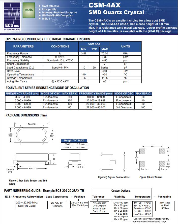 | ECS-40-20-28AX-TR | CSM-4AX | 4MHz | ±30ppm | 20pF | -10°C ~ 70°C | HC49/US |