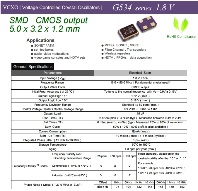 MERCURY晶振,壓控晶振,G534晶振,瑪居禮有源晶體振蕩器.VCXO是指這款晶體產(chǎn)品控制功能只有單壓控也就是電壓控制功能,產(chǎn)品本身頻率精度可以隨著電壓搞定起伏來(lái)自動(dòng)調(diào)整頻率,使產(chǎn)品永遠(yuǎn)控制在一定的頻率范圍,壓控晶振(VCXO)壓控石英晶體振蕩器基本解決方案,PECL輸出,輸出頻率60 MHz到200 MHz之間,出色的低相位噪聲和抖動(dòng),三態(tài)功能,應(yīng)用:SDH/ SONET,以太網(wǎng),基站,筆記本晶振應(yīng)用, VCXO,壓控晶體應(yīng)用:調(diào)制解調(diào)器,ADSL網(wǎng)絡(luò)控制器,無(wú)線基站,程控交換設(shè)備智能手機(jī),筆記本晶振等.