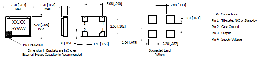 MIH305048AH-25.000MHZ-T,Mmdcomp石英晶振,7050mm振蕩器,無線模塊晶振,尺寸圖
