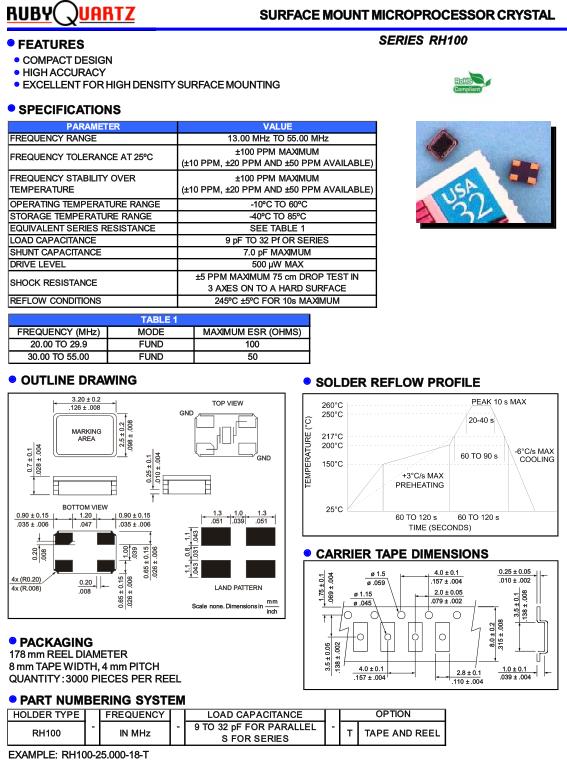 RH100水晶振動子,盧柏進口晶振,RH100-26.000-18-T無源諧振器,超小型表面貼片型SMD晶振,最適合使用在汽車電子領(lǐng)域中,也是特別要求高可靠性的引擎控制用CPU的時鐘部分.低頻晶振可從7.98MHz起對應(yīng),小型,超薄型具備強防焊裂性,石英晶體在極端嚴酷的環(huán)境條件下也能發(fā)揮穩(wěn)定的起振特性,產(chǎn)品本身具有耐熱,耐振,耐撞擊等優(yōu)良的耐環(huán)境特性,滿足無鉛焊接以及高溫回流溫度曲線要求,符合AEC-Q200標準.