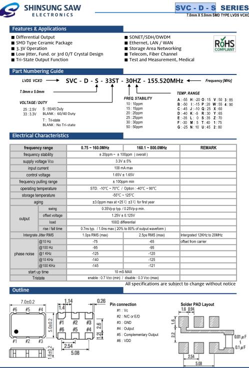 SHINSUNG韓國晶振,SVC-D-S壓控晶振,SVC-D-S-33ST-30HZ-155.520MHz差分晶振,小型SMD有源晶振,從最初超大體積到現在的7050mm,6035mm,5032mm,3225mm,2520mm體積,有著翻天覆地的改變,體積的變小也使產品帶來了更高的穩定性能,接縫密封石英晶體振蕩器,精度高,覆蓋頻率范圍寬的特點,SMD高速自動安裝和高溫回流焊設計,Optionable待機輸出三態輸出功能,電源電壓范圍:1.8V~5V,高穩定性,低抖動,低功耗,主要應用領域:無線通訊,高端智能手機,平板筆記本WLAN,藍牙,數碼相機,DSL和其他IT產品的晶振應用,三態功能,PC和LCDM等高端數碼領域,符合RoHS/無鉛.
