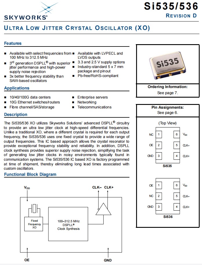 XO晶體振蕩器536EB156M250DG提供一個高速差分頻率的超低抖動時鐘,Silicon晶振Si535/536 XO支持多種選項,包括頻率、溫度穩定性、輸出格式和VDD。貼片石英晶振Si535和Si536 XO系列采用工業標準,RoHS兼容,6墊腳,5x7mm封裝。Si536系列支持一個用于LVPECL和LVDS輸出格式的替代OE針腳(針腳#1)。