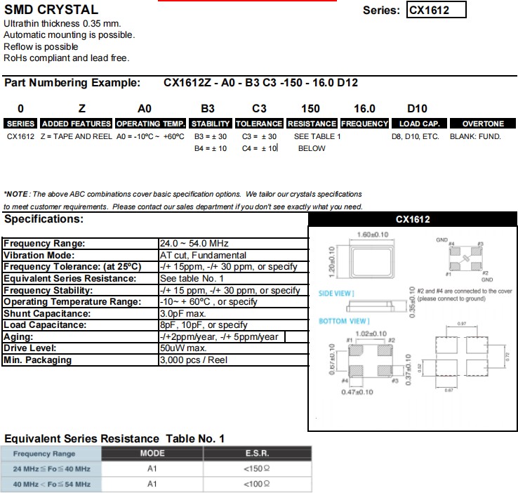 Cardinal晶振推出三款新的小尺寸石英晶體CX1612,CX2016和CX252,編碼CX1612Z-A0-B3C3-150-16.0D12,無源晶振