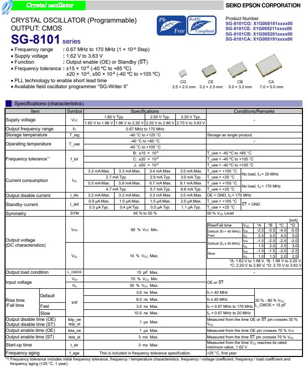 | X1G005191001800 | SG-8101CA | 73.333700 MHz | 7.00 x 5.00 x 1.40 mm | CMOS | 1.620 to 3.630 V | -40 to 85 °C |