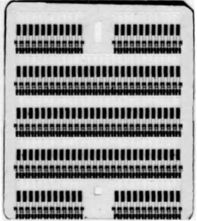 These wafers were chemically etched to a predetermined frequency using an electron beam vacuum deposition system, cleaned and metallized with a film of chromium and gold. (Other metals, such as aluminum or silver can be used.) The AT stripe pattern is created by photolithographic techniques using a mask and a double aligner, where the top and bottom surfaces of the wafer are simultaneously aligned and exposed. The crystal electrode and probe pad pattern are then defined by subsequent photomask steps. The wafer is then chemically etched with metal and quartz to form individual AT strips. Finally, the top and bottom mounting pads are joined together using an aperture mask and thin film metal deposition [2].