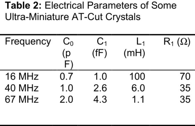 Recall that the isolation mode of the crystal is electrically modeled as a parallel combination of capacitor C 0 and inductor L 1 , capacitor C 1 and resistor R 1 . The difference is that the difference between an ultra-small AT crystal and a larger brethren is a larger series resistance R 1 and a smaller series capacitance C 1 (both due to the smaller area of ??the electrode [3]). In Table 2, we present the electrical parameters of three CX-4 AT crystals at three different frequencies. Using these values ??to calculate the value of their larger CX-1 counterpart (not shown here), we find that R 1 is about 2 to 3 times the resistance of its larger CX-1 counterpart, while C 1 is approximately It is a value of one-half to one-third of CX-1.