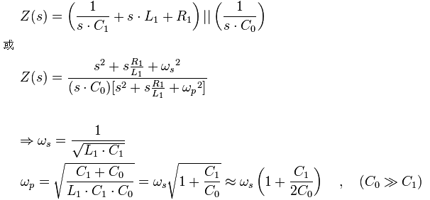 個頻率接近但特性不同的共振點:低阻抗的串聯(lián)共振點與高阻抗的并聯(lián)共振點。 運用拉普拉斯轉(zhuǎn)換,該等效電路網(wǎng)絡(luò)的阻抗可以寫成以下數(shù)學(xué)式: