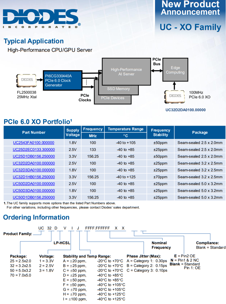 DIODES公司UC型號石英晶體振蕩器的超低抖動使其成為網絡和計算應用中PCIe 6.0時鐘的理想選擇。PCIe 6.0標準100MHz頻率,可選25~161MHz頻率范圍,靈活的頻率選擇支持各種系統設計要求,低15mA電流,支持1.8V, 2.5V, 3.3V供電電壓,標準HCSL器件的一半供電電流,超低<100fsRMS的抖動,片上終端無需外接電阻,節省電路板空間,降低成本。 特征,超低相位抖動,最大有效值0.1ps。(12kHz至20MHz),溫度范圍擴展至125℃,完全無鉛和完全符合RoHS標準,無鹵素和銻。“綠色”產品,在單獨的數據表(UCQ系列)下提供符合汽車標準的部件。應用程序,網絡系統,光學模塊,服務器和存儲系統,專業視頻設備,測試與測量,FPGA/ASIC時鐘生成,112 g系列應用程序。